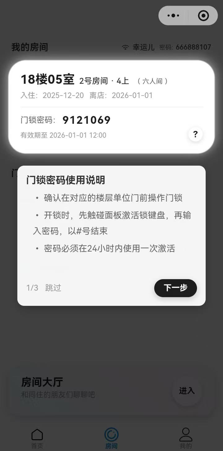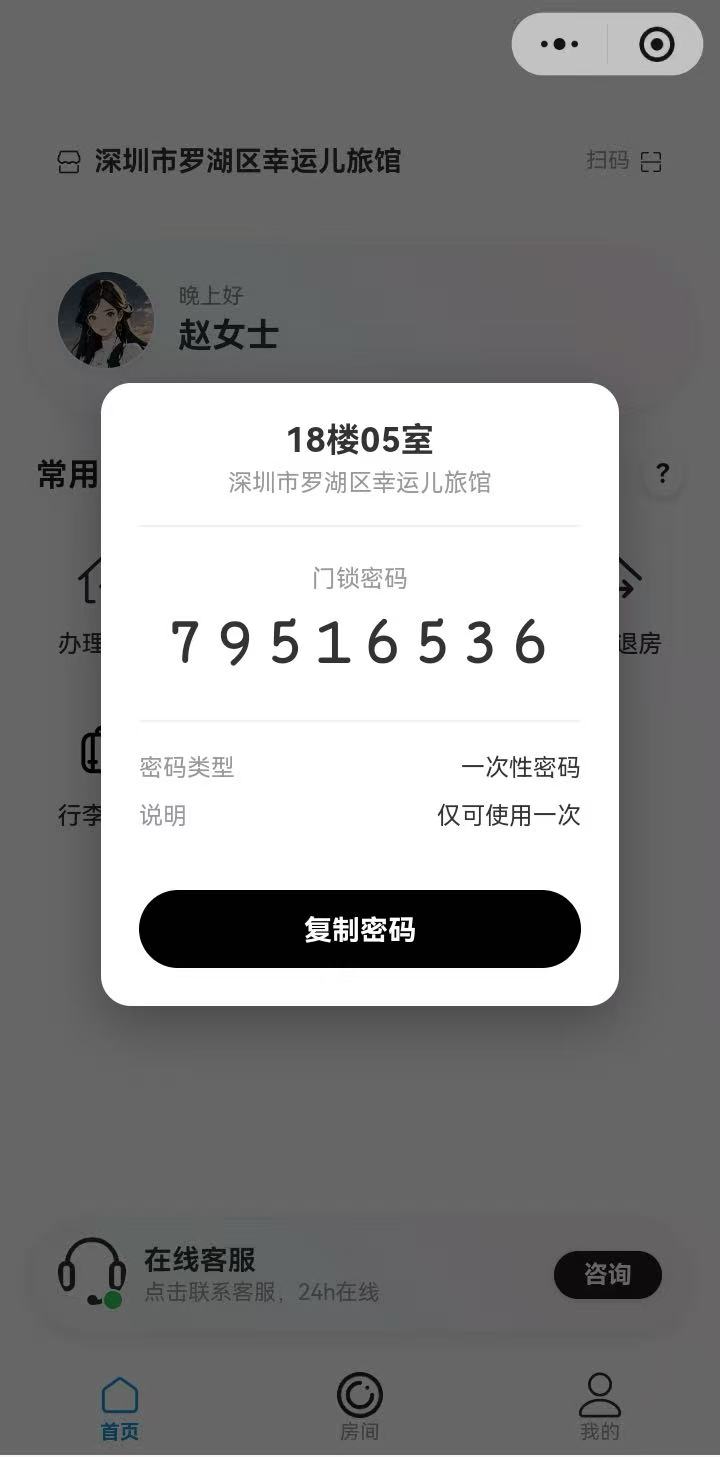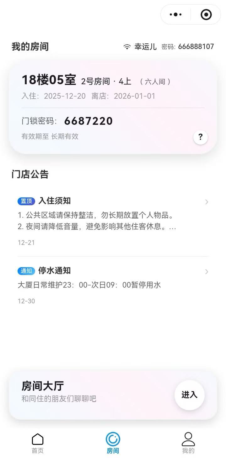 入住自动下发密码,退房自动失效,杜绝钥匙复制风险。